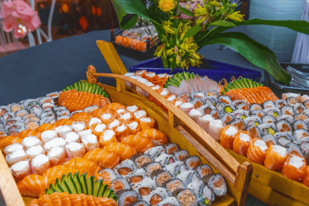 Sushis e Sashimis, alguns dos pratos comercializados durante o Bon Odori — Foto: Acervo ANBG – Kaikan