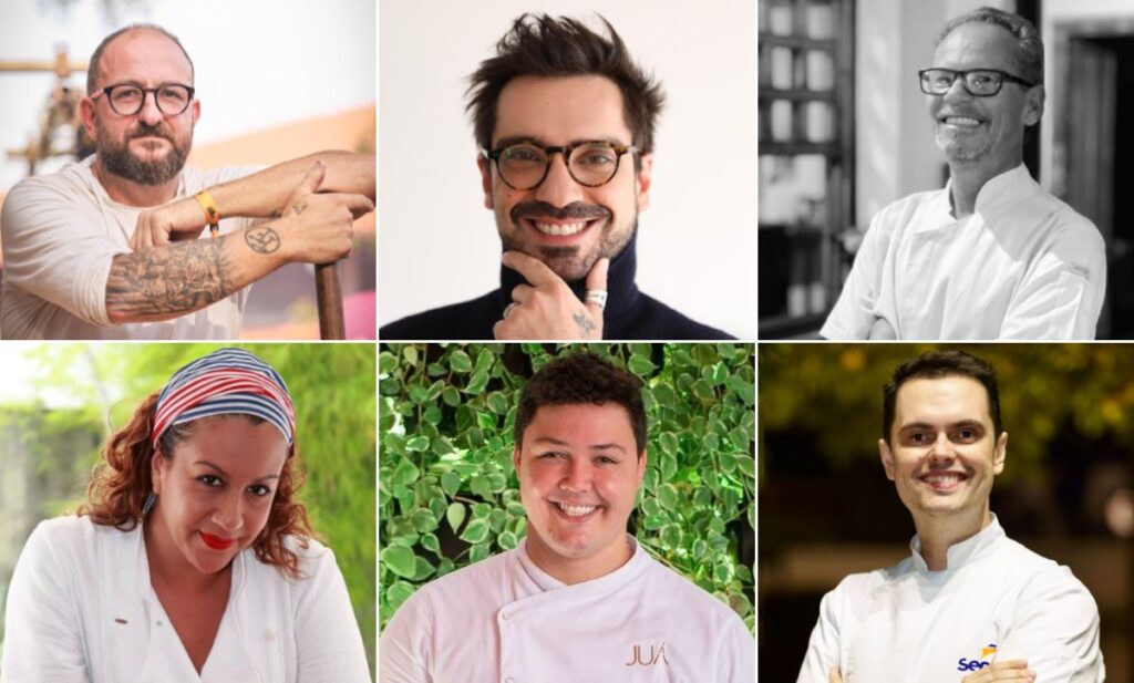 Os chefs Marcos Livi, Lucas Corazza, Aloísio Godinho, Emiliana Azambuja, Junior Marinho e Márcio Zago estarão na Arena Gastronômica Senac — Fotos: divulgação