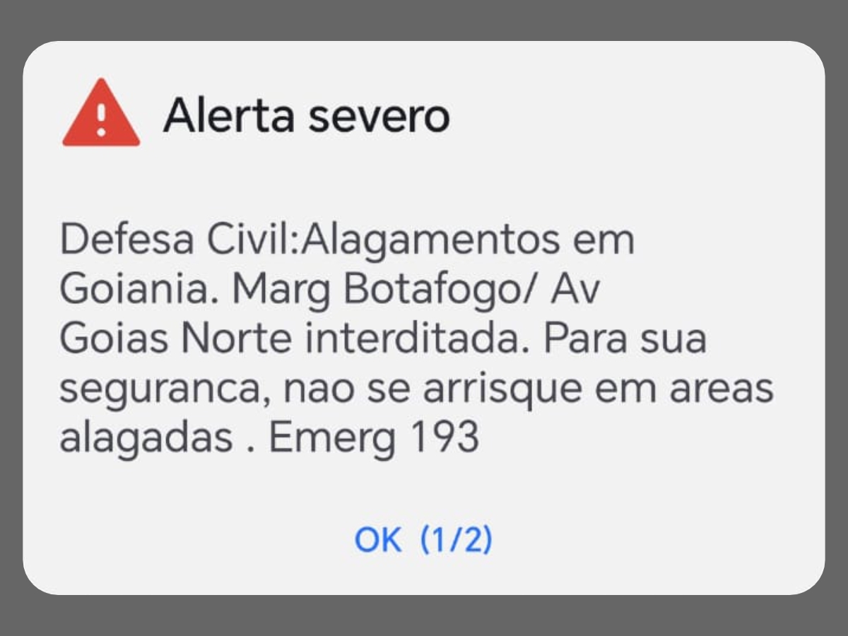 A Prefeitura de Goiânia, por meio da Defesa Civil Municipal, enviou um alerta sonoro de emergência para os celulares dos goianienses na tarde desta terça-feira (16/12), devido às fortes chuvas que caem sobre a capital goiana.